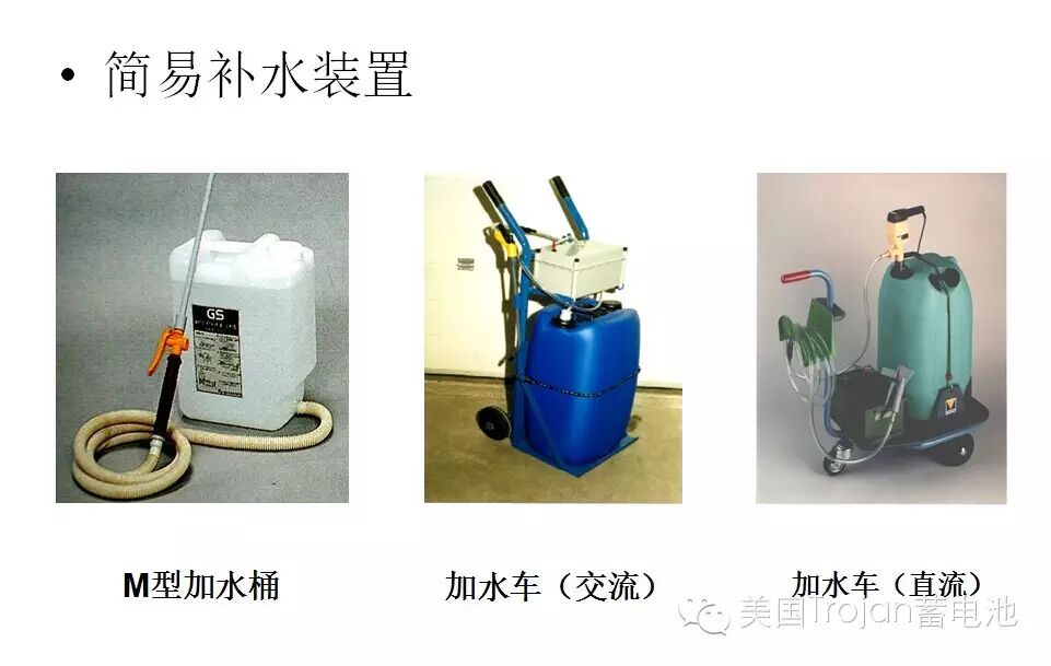 给蓄电池补水的常用工具有:量杯、简易加水桶、加水车。另外还可以利用一次性补水系统。给蓄电池补水切忌使用金属器皿(铅制器皿除外)